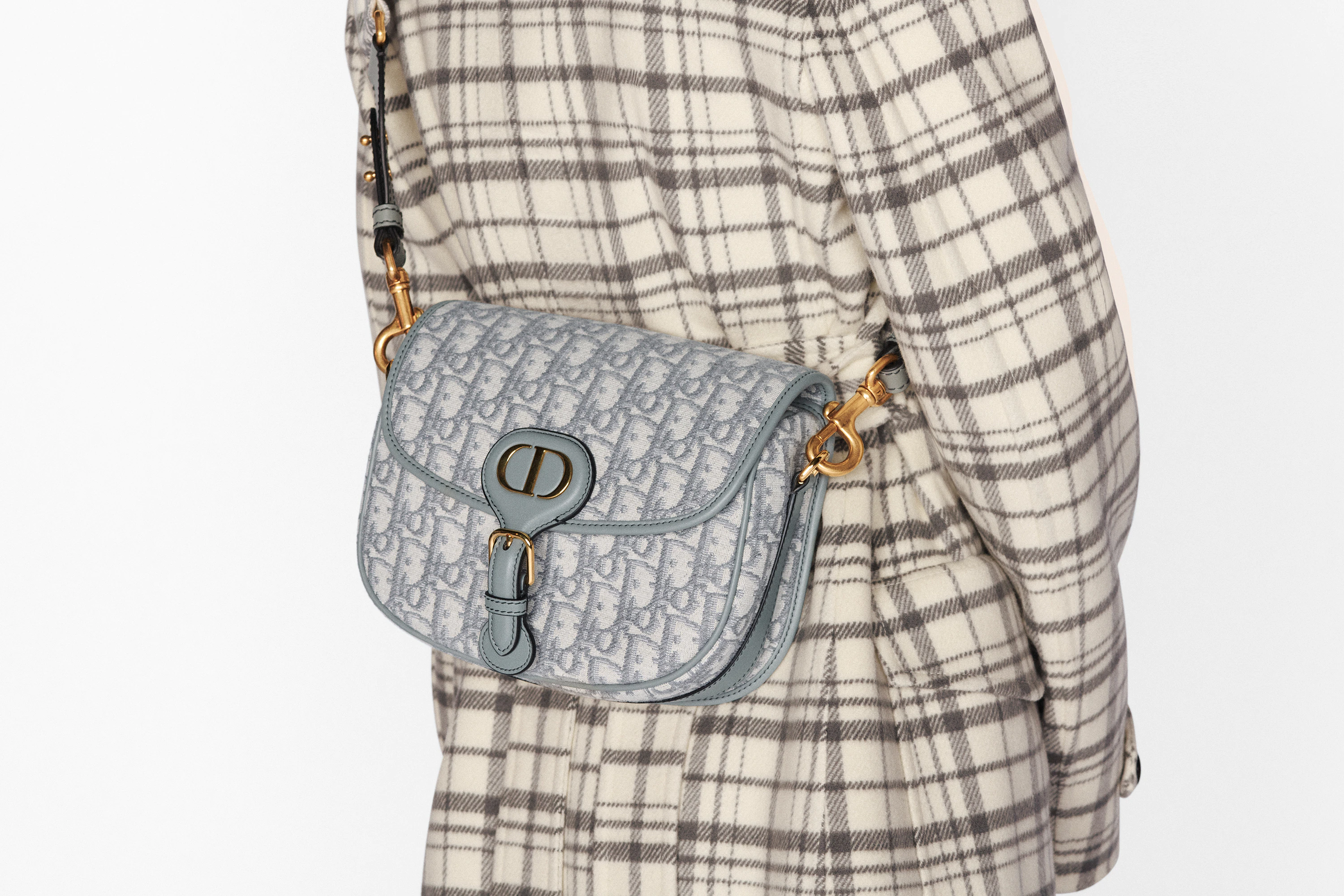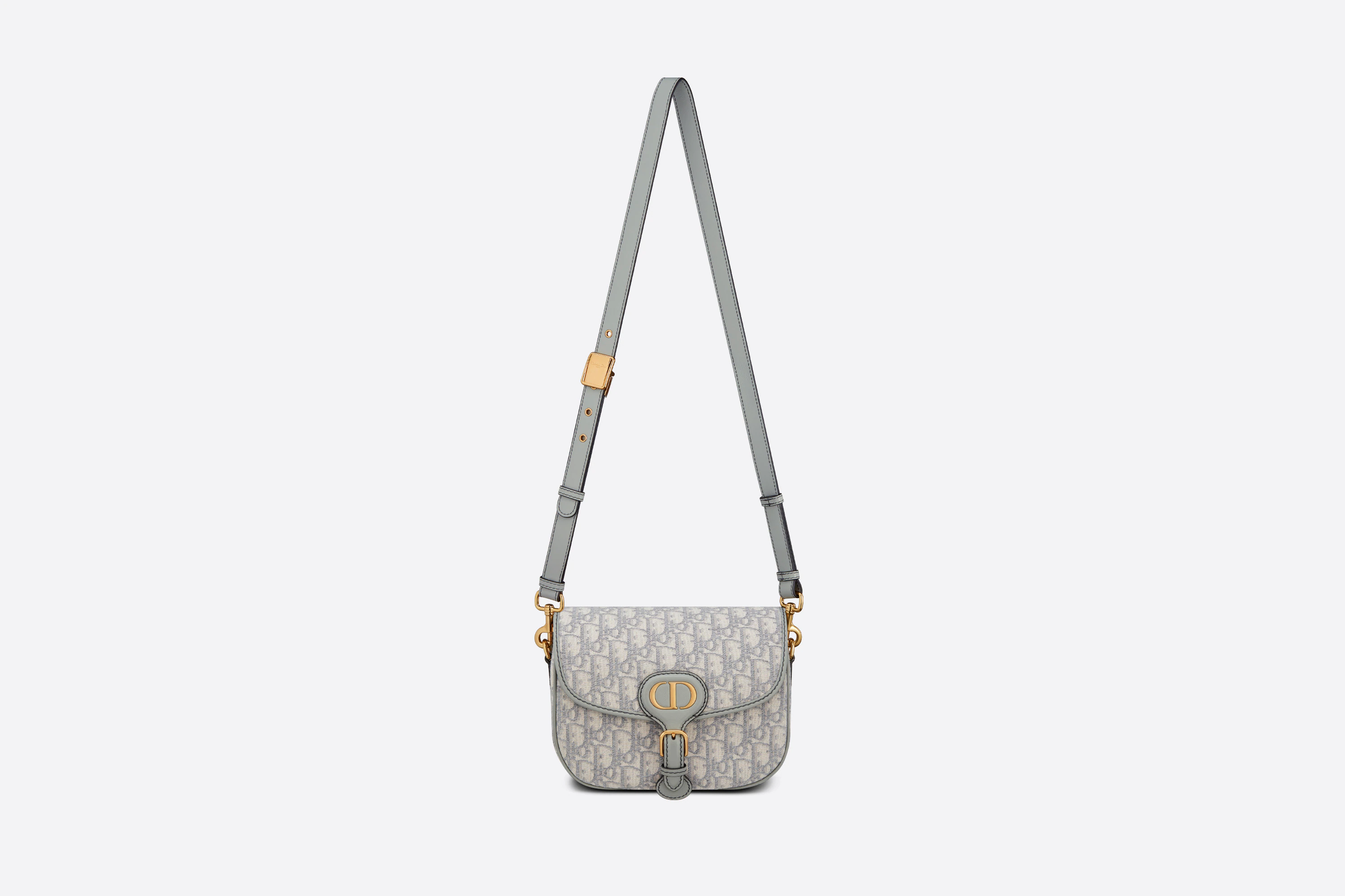 The Dior Bobby bag is a hobo style showcasing sophisticated lines and harmonious proportions. The design is crafted from gray Dior Oblique jacquard and enhanced by antique gold-finish metal hardware. Its removable and adjustable shoulder strap has a military-inspired buckle. and allows the medium shape to be carried by hand. worn over the shoulder or crossbody.