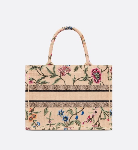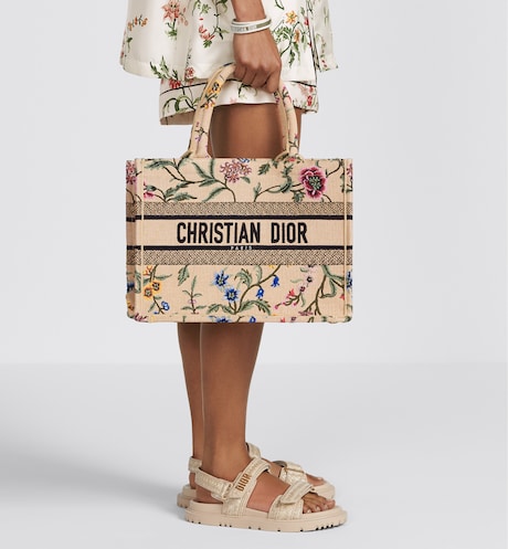 Introduced by Maria Grazia Chiuri. Creative Director of Christian Dior. the Dior Book Tote has become a staple of the Dior aesthetic. Designed to hold all daily essentials. the style is crafted in natural raffia embroidered with a multicolor Dior Petites Fleurs motif. a romantic and vibrant homage to Mr. Dior's passion for florals. Adorned with the Christian Dior Paris signature on the front. the medium tote exemplifies the House's signature savoir-faire and may be carried by hand or worn over the shoulder.