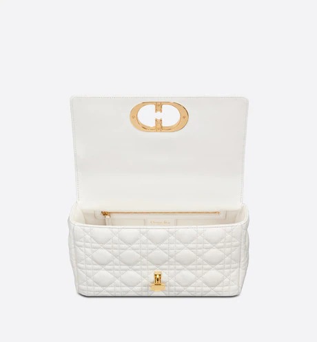 The Dior Caro bag combines modernity with timeless elegance. The medium silhouette is crafted in ivory calfskin with Cannage topstitching. The supple bag features a flap adorned with an antique gold-finish metal 'CD' twist clasp. inspired by the seal of a Christian Dior perfume bottle. The detachable chain shoulder strap with 'CD' signature links allows the bag to be carried by hand or worn over the shoulder and may be replaced by one of the House's wide embroidered straps for day or evening attire wear.