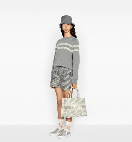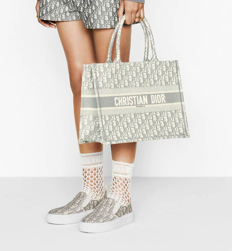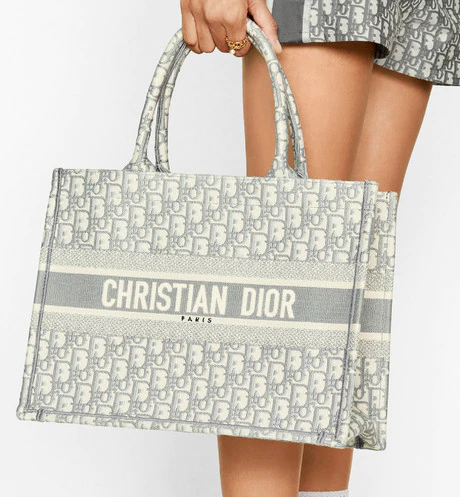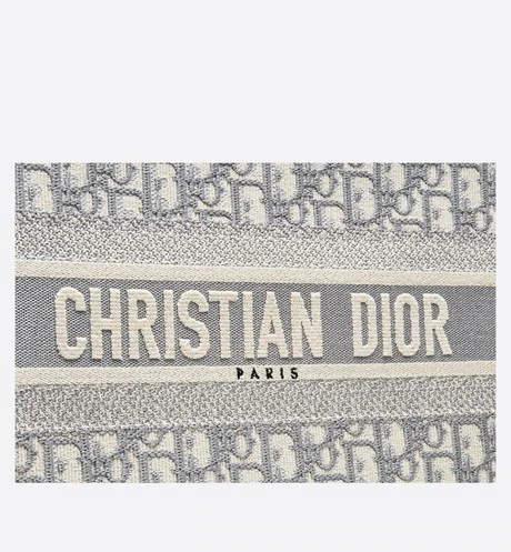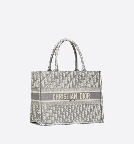 The Dior Book Tote is an original creation introduced by Dior's Creative Director. Maria Grazia Chiuri. and has become a staple of the Dior aesthetic. Designed to hold all the daily essentials. it is fully embroidered with the gray Dior Oblique motif and adorned with a 'CHRISTIAN DIOR' signature on the front. The small tote exemplifies the House's signature savoir-faire and may be carried by hand or worn over the shoulder.