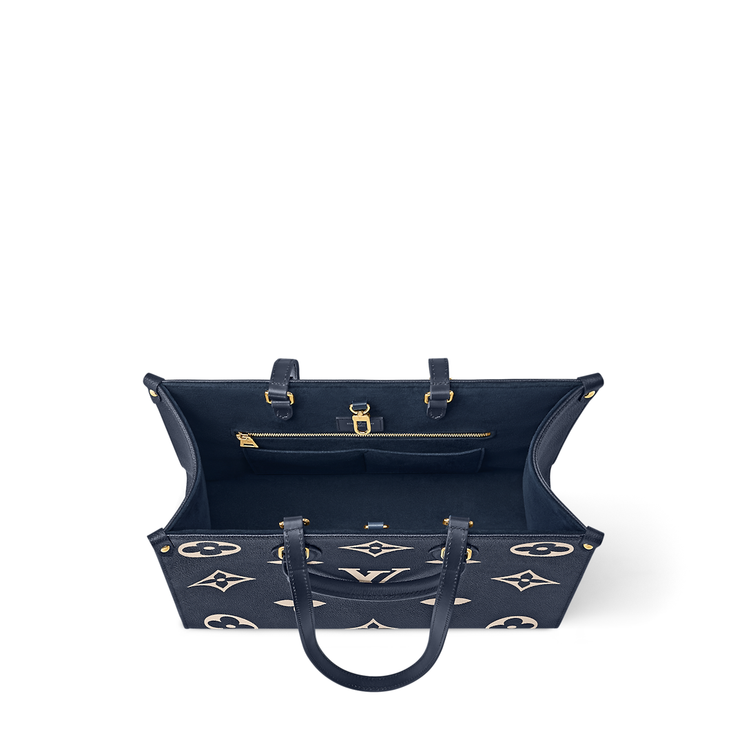 「ノーティカル」カプセル・コレクションの一部である「オンザゴー MM」。レザーにメゾンを象徴するモノグラム・パターンをエンボス加工してからプリントを施した、モノグラム・アンプラント レザーで仕立てました。13インチのノートパソコンを収納できる容量と2組のハンドル──手持ち用の2本のショートハンドルと肩掛け用の2本のロングハンドルを備えています。