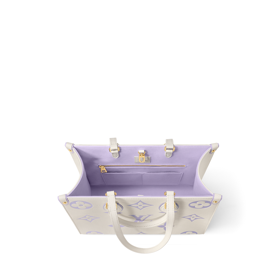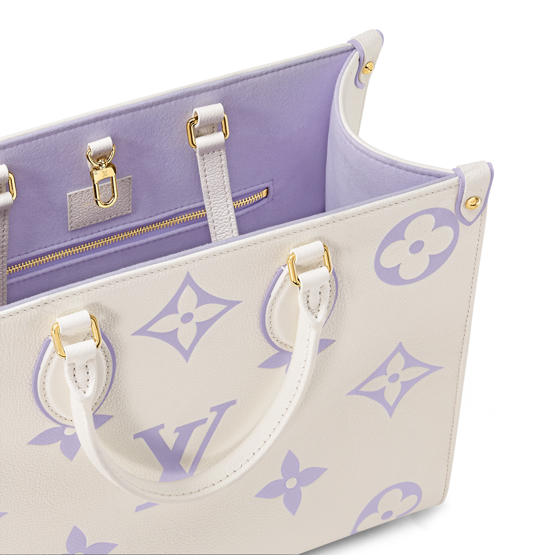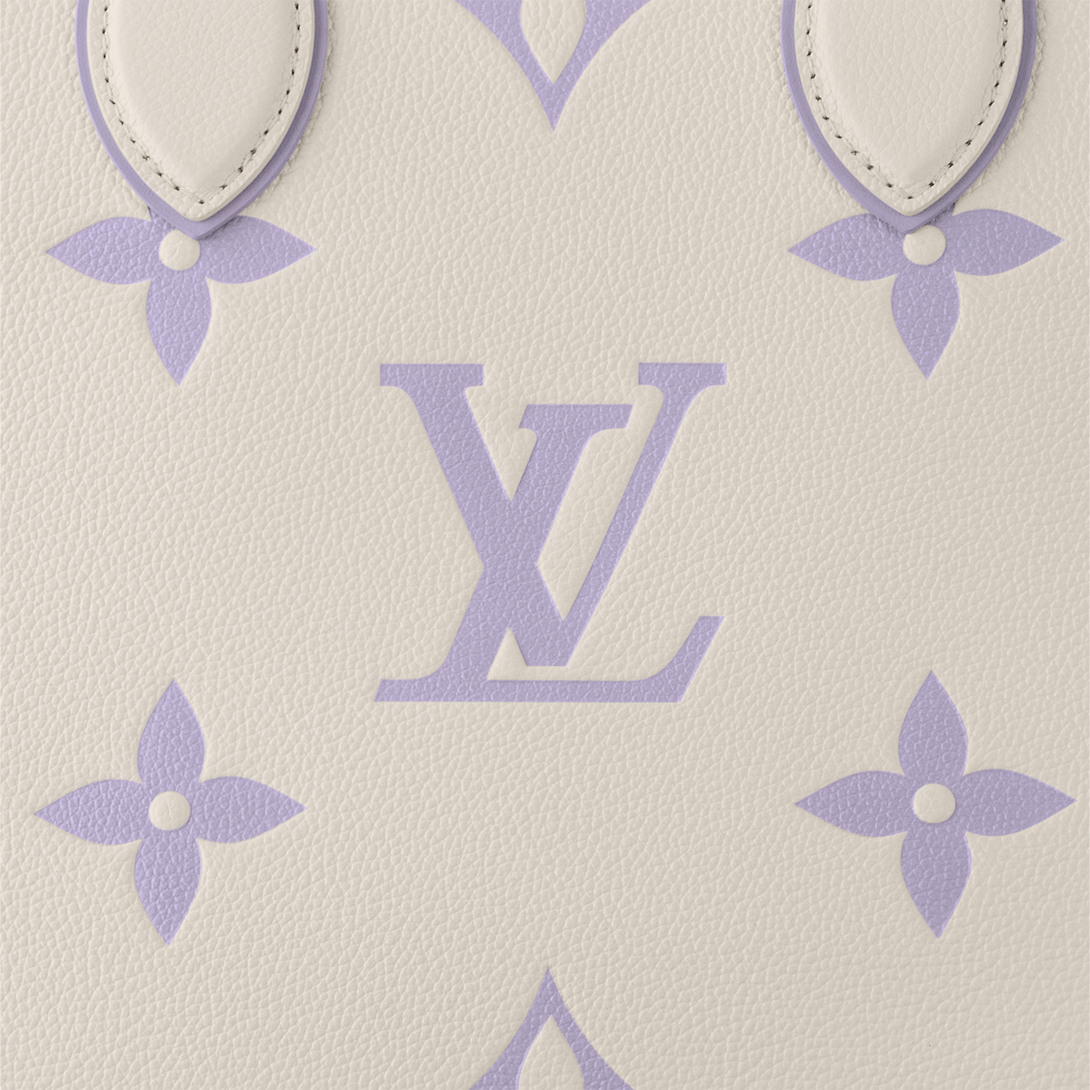 落ち着いたパステルカラーのモノグラム・アンプラント レザーがフレッシュな雰囲気を演出する「オンザゴー MM」。13インチのノートパソコンを収納できる実用的なアイテムは、ロングとショートの2組のハンドルで手持ちでも肩に掛けても楽しめます。ハンドルマウントとコーナータブも、パステルカラーで仕上げました。