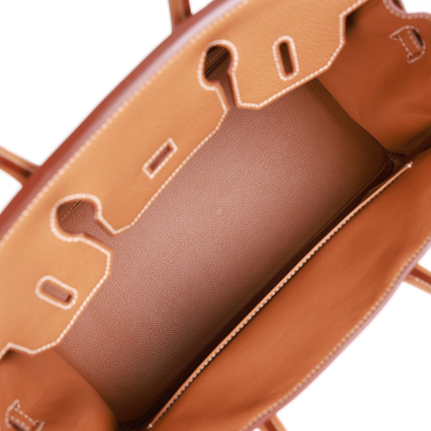 This Birkin is in gold togo leather with gold hardware and has white contrast stitching. front flap. two straps with center toggle closure. clochette with lock and two keys. and double rolled handles.