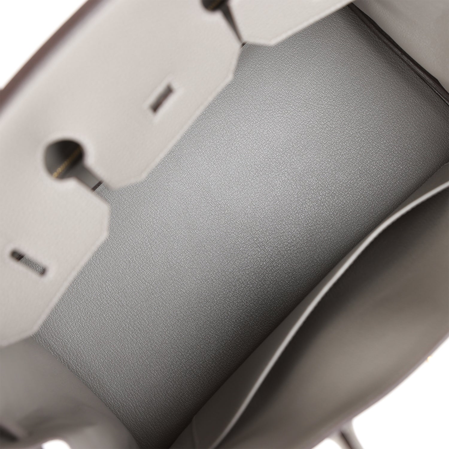 This Birkin is in Gris Meyer togo leather with gold hardware and features tonal stitching. front flap. two straps with center toggle closure. clochette with lock and two keys and double rolled handles.