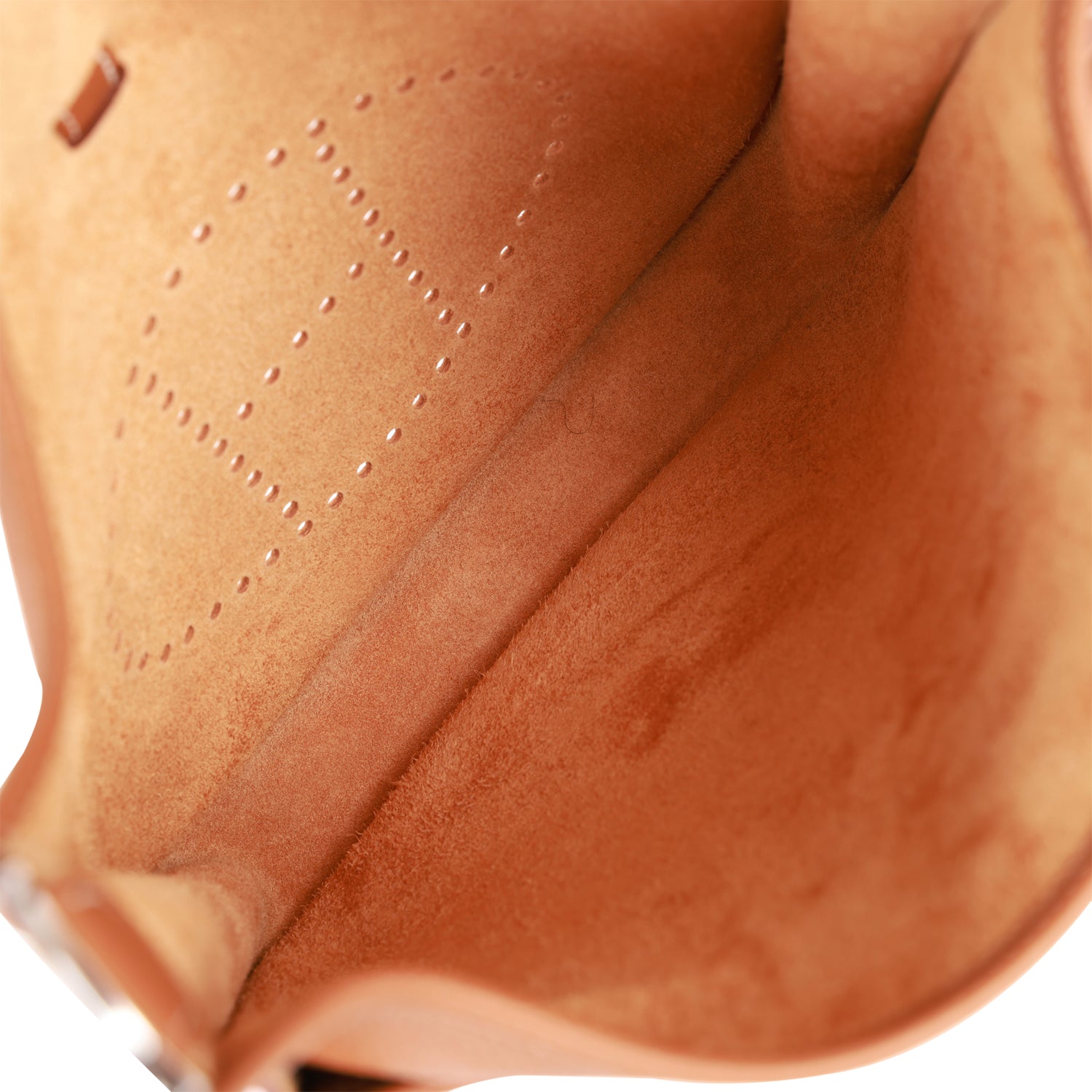 This Evelyne is in Gold clemence leather with palladium hardware and has contrast stitching. pull tab top closure and gold removable canvas and leather shoulder/crossbody strap.