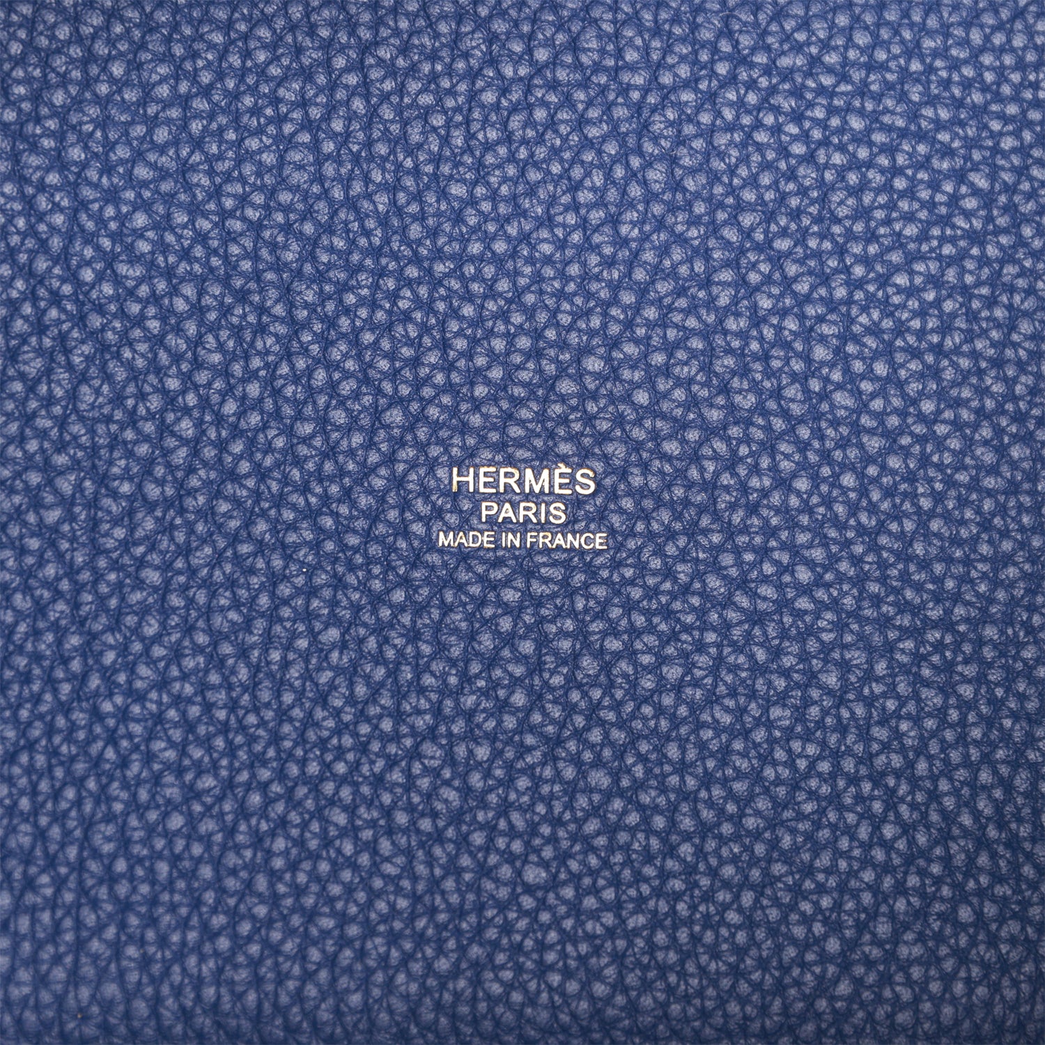 This Picotin Lock is in Bleu Saphir clemence leather with gold hardware and has tonal stitching with two top handles.