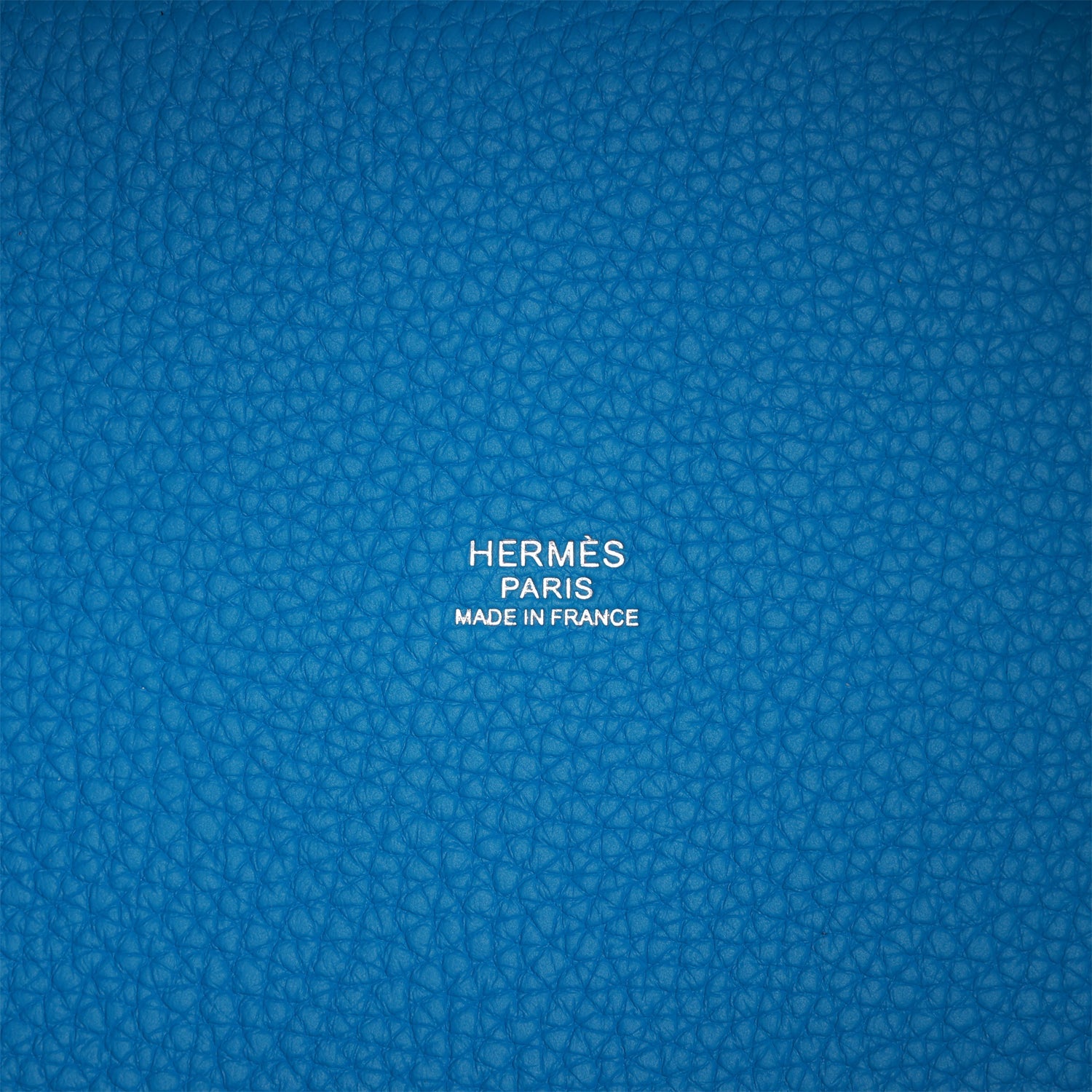 This Casaque Picotin is of Rouge de Coeur. Rose Extreme. and Bleu Zanzibar Clemence leather with palladium hardware and has tonal stitching with two top handles