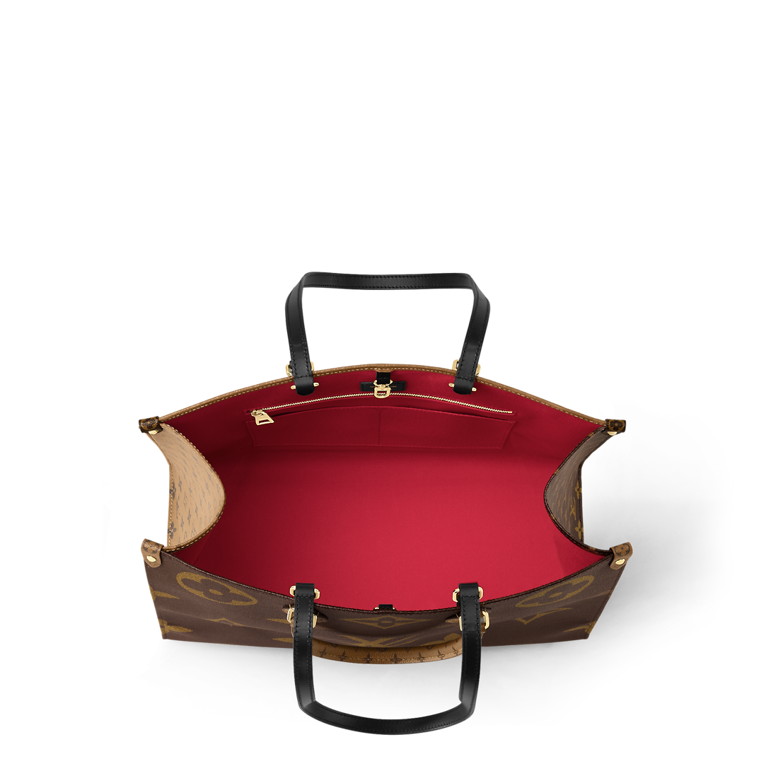 インパクトあるデザインと機能性を兼ね備えた「オンザゴー GM」。ジャイアント・モノグラム キャンバスで仕立て、両サイドとハンドルにモノグラム・リバース パターンをあしらうことで、異なる色とスケール感がスタイリッシュなコントラストを描く特別な1品に仕上がりました。収納力に優れ、日常使いに最適なバッグです。