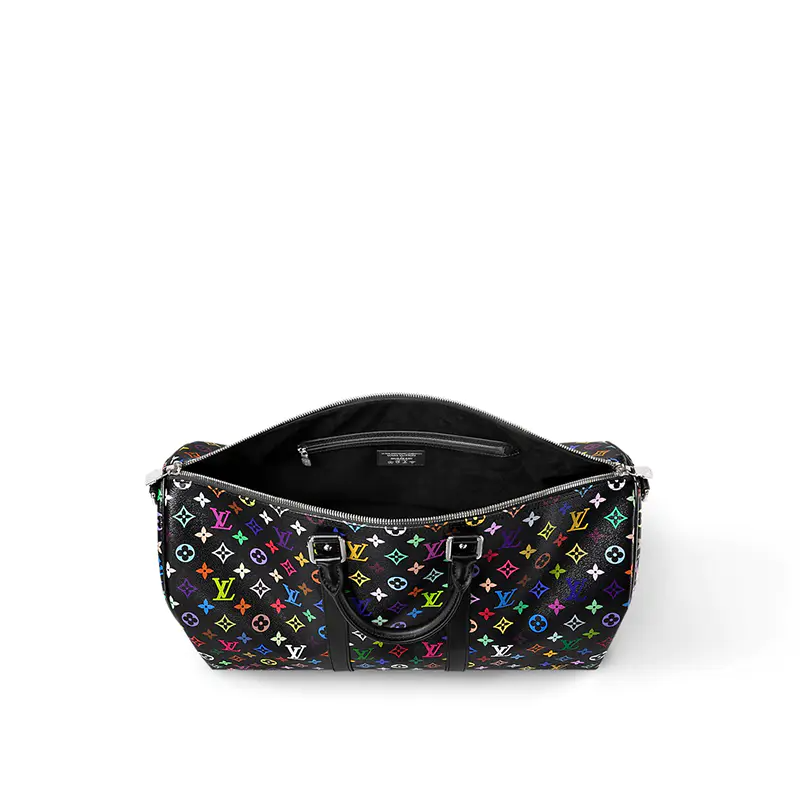 キーポル バンドリエール 50 トラベル バッグは、虹色のモノグラム コーティング キャンバスで作られており、有名な日本のアーティスト、村上隆の独特のスタイルに遊び心たっぷりに敬意を表しています。機内持ち込み手荷物のサイズに十分なスペースが隠されており、すっきりとしたレザーのサイドストラップが構造を豊かにしています。南京錠、ネームタグ、キーホルダーがブランドの旅行の伝統を思い出させ、トップハンドルと取り外し可能で調節可能なショルダーストラップが外観を完成させています。