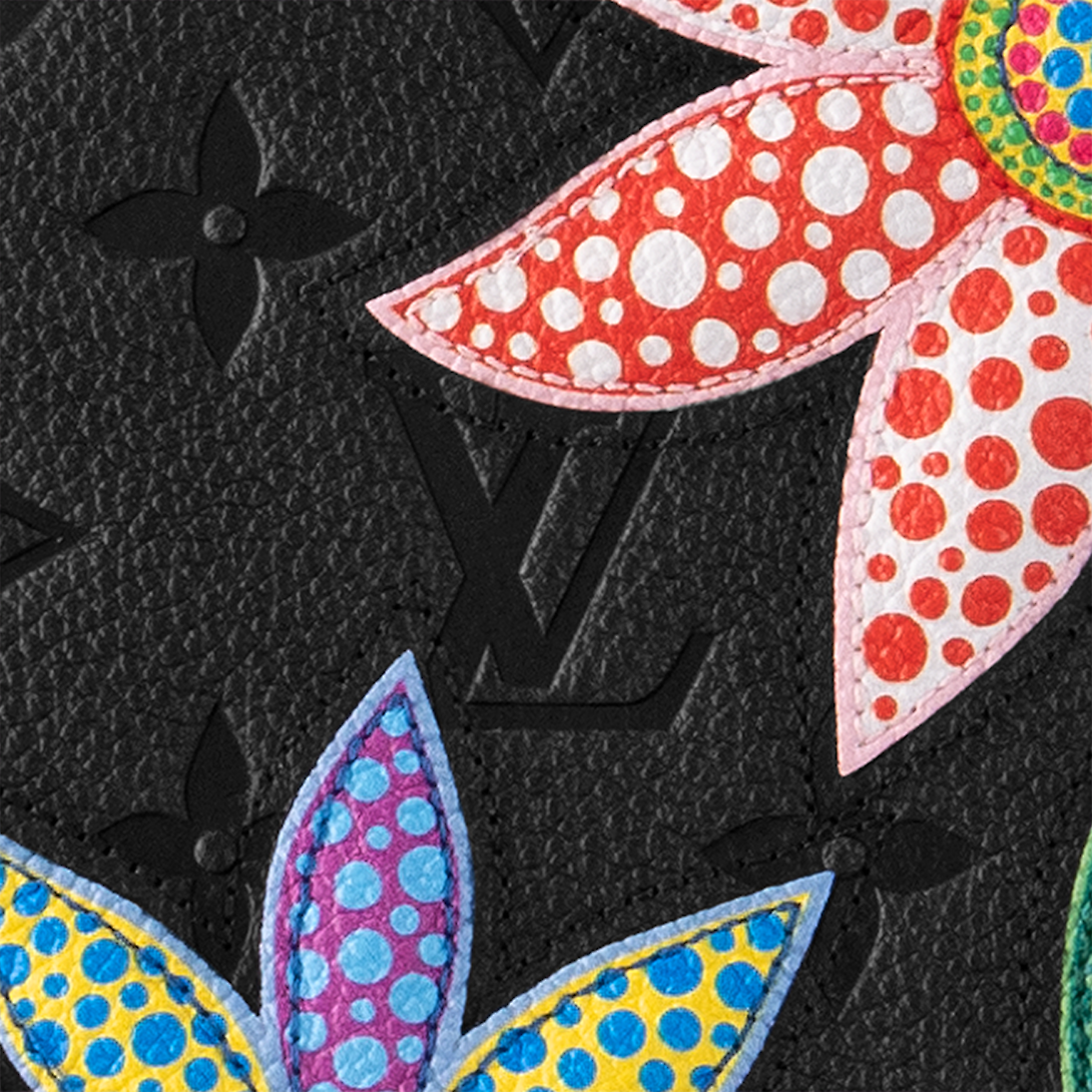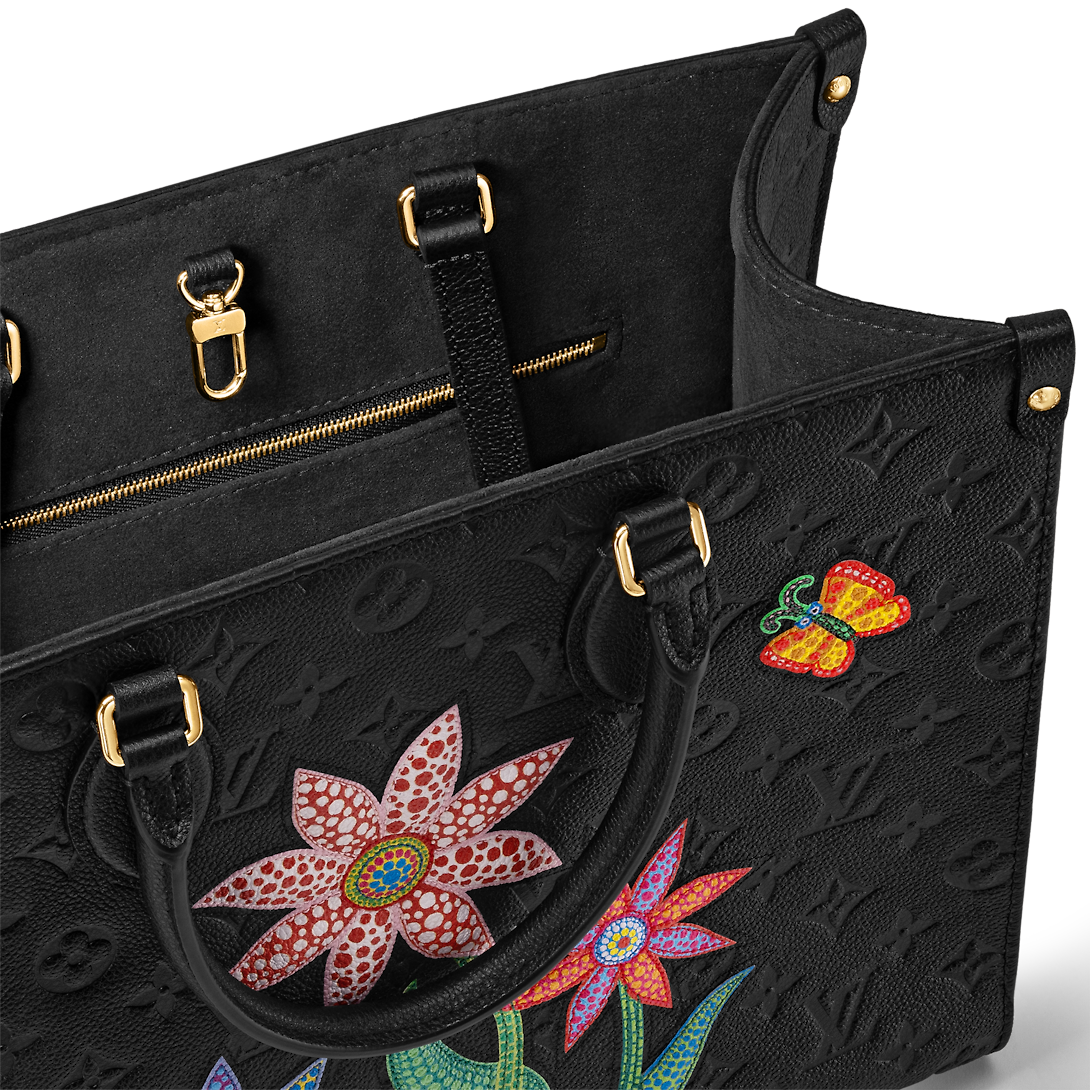 「ルイ・ヴィトン × 草間彌生」コレクションの中でも 一際目を引くデザインにアレンジした「LV × YK オンザゴー MM」。ラグジュアリーな印象のブラックのモノグラム・アンプラント レザーに 繊細な「フラワー」のモチーフがあしらわれています。日本の田舎で種苗業を営む両親の元で育った草間彌生は キャリアを通して花々を作品の重要なテーマとして扱ってきました。傑作アートとクラフツマンシップが融合した 大容量で実用的なバッグです。
